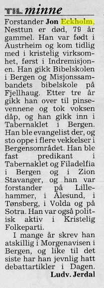 – våre foreldres gode venn Jon Eckholm reiste hjem i hast 24. juli 1998, til stor sorg for svært mange. Eckholm var født 2. januar 1919, og ble dermed 79 år gammel.