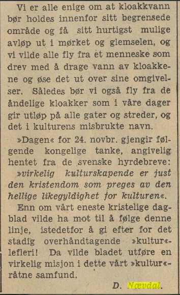 – i «Dagen»s lørdagsutgave 7. januar 1939; her skriver Nævdal veldig interessant om den kristnes syn på en slik aktuell sak som litteraturen og kulturen i videre forstand; og her kjenner vi igjen beveggrunnene for Iver Emanuel Høys offentlige engasjement i forbindelse med den svært kontroversielle oppsetningen av musikalen «Hair» på den Nationale Scene i Bergen senhøstes 1970. På dette tidspunkt var Daniel og Iver Emanuel nære naboer, både geografisk, siden de begge var bosatt i Øisteinsgaten, og ikke minst i kulturell og åndelig betydning.