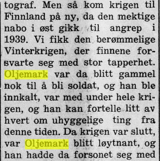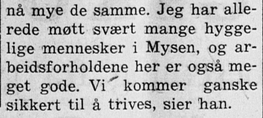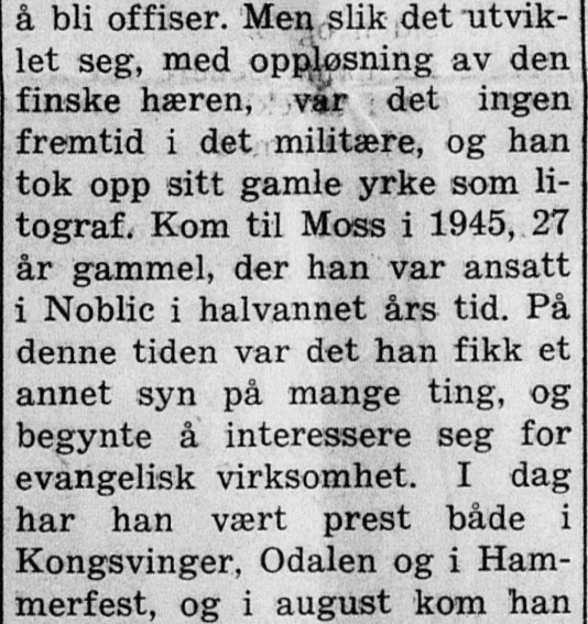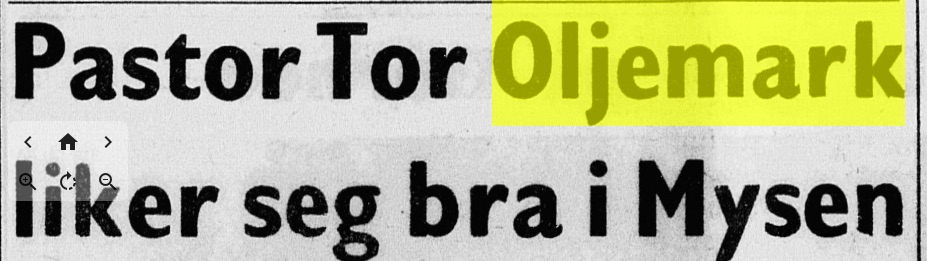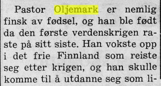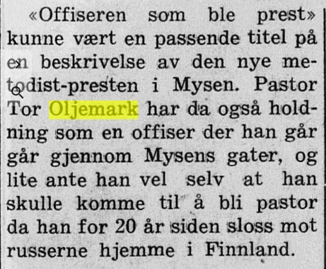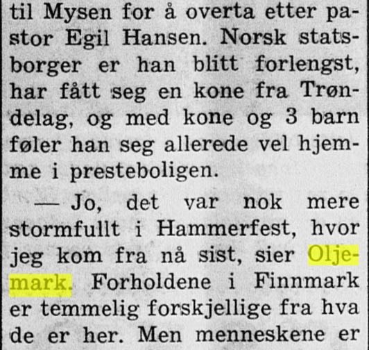 – da vår fars kollega kom til Mysen som prest, fra tjeneste i Hammerfest; i 1967 ble familien Oljemark, Tor Oljemark selv og kone og 3 sønner, forflyttet til Notodden, mens vi var i nabobyen Kongsberg. På Notodden var de bare ett år, og ble da forflyttet til Kongsvinger. Men her er artikkelen fra 23. september 1964 :
