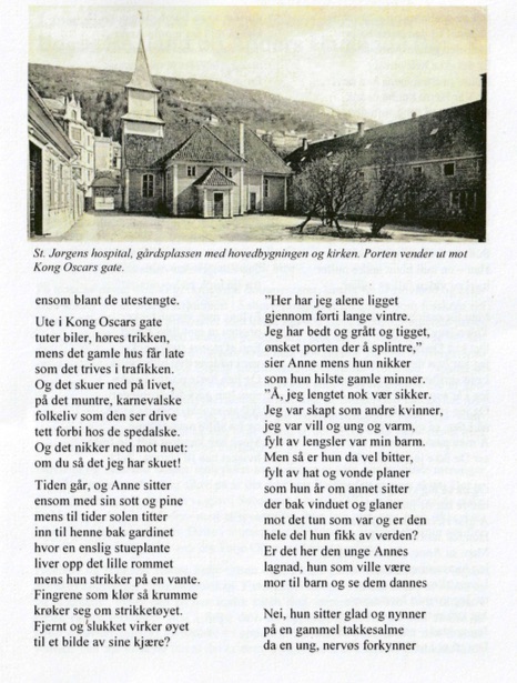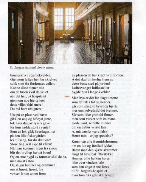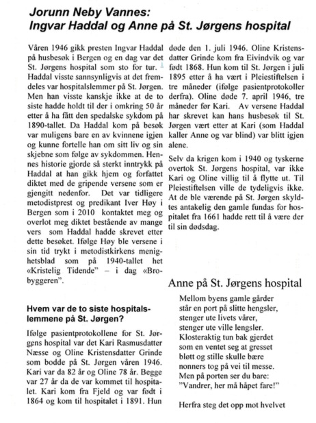 Diktet var inntatt i julenummeret av metodist-bladet Kristelig Tidende for 1957; men en liten kommentar om tidspunktet da dette Ingvar Haddals besøk skjedde må gies her : Haddal fikk sin første «beordring» som nybakt presteutdannet ved Øverås, Metodistkirkens Teologiske Skole i Gøteborg, fra august 1938 i tjeneste som hjelpe-pastor i Første Metodistkirke i Skottegaten 15 på Nordnes. Da var han såkalt «diakon» eller «på prøve», etter kirkens reglement; det er dermed veldig sannsynlig at det var i denne egenskap han foretok besøket ved St. Jørgens Hospital våren 1939. Da var han kun 24 år gammel, noe som passer til det som fremkommer i diktet. Våren 1946 var han etablert pastor og menighetsforstander for metodistmenigheten i Ålesund, før han i 1948 ble beordret til Tromsø;