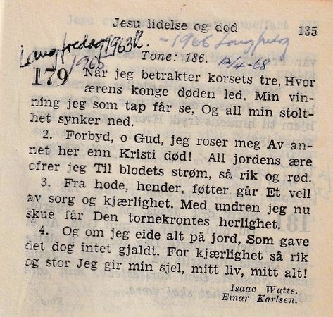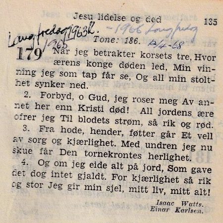 Når jeg betrakter korsets tre, Hvor ærens konge døden led, Min vinning jeg som tap får se, Og all min stolthet synker ned.