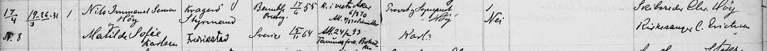 – født Karlsen; Mathilde Sofie kom fra Bohuslen, født i 1864 og reiste til Norge som ung jente for å søke tjeneste. Det fikk hun flere steder på Østlandet, selv om området omkring Bamble og Langesund var populære steder for svenske ungjenter å søke beskjeftigelse.