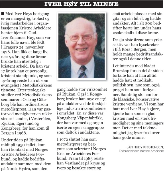 Minneord etter Iver Emanuel i avisen Norge i Dag – skrevet av Jan Rudy Kristensen i Kristne Arbeidere