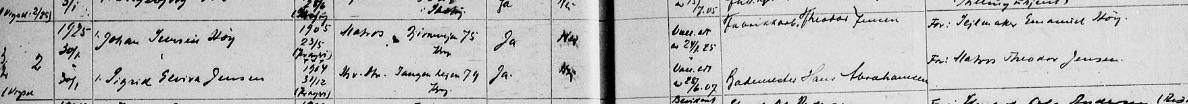 Her ser vi fra kirkeboken innførselen av Sigrid Elviras og Johan Severins giftemål i Kragerø kirke;