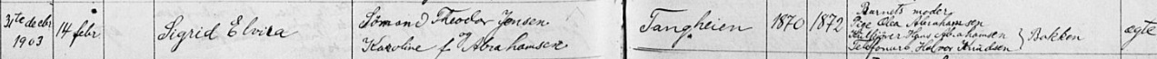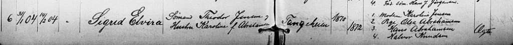 Iver Emanuels mor Sigrid Elviras fødsel og dåp innført i kirkebøkene i Kragerø