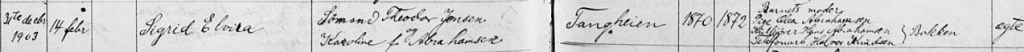 – ser vi her; først fra Ministerialboken, der vår farmors Sigrid Elviras fødsel – 31. desember 1903 – først er ført rett av presten, som kan ha vært Lars Robert Hirsch, som kom til Kragerø som sogneprest i 1904;