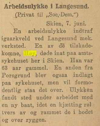 – her står : «Arbeidsulykke i Langesund. (Privat til «Soc.-Dem.») Skien, 7. juni. En arbeidsulykke indtraf igaarkveld ved Langesund mek. verksted. En av de tilskadekomne, Høy, døde inat paa amtssykehuset her i Skien. Han var 63 aar gammel. En anden fra Porsgrund blev ogsaa indlagt paa sykehuset, men vil formodentlig staa det over. Ulykken fandt sted under arbeidet med en ny baat, idet en kjætting røk tvers av og rammet de i hodet og over ryggen».