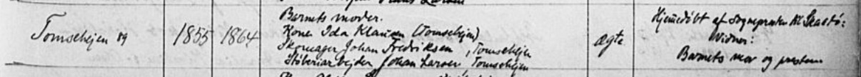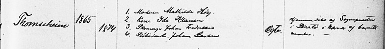 Som faddere er oppført «Barnets moder, kone Ida Klausen (Tomsehejen), skomager Johan Fredriksen, Tomsehejen og støberiarbejder Johan Larsen – alle Tomsehejen.- tilsvarende ser vi fra klokkerboken :