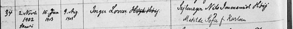 – og som vi her ser, ble Inger Louise født 2. november 1902 og døpt hjemme i Tomsehejen 89 «af Sognepresten til Skaatø» dato 16. januar 1903; vi finner ut hvem som var sogneprest på dette tidspunkt.