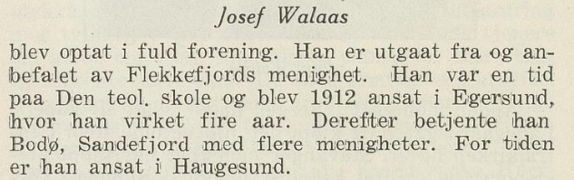 Her er noe som ble nevnt om Josef i boken «Den norske metodistkirkes historie», av J. Thorkildsen, på side 387; ved årskonferansen i Stavanger i 1916 var Walaas’ første ansettelse over – etter 4 år i Egersund, hvor han hadde betjent menigheten etter at den teologiske skolen var gjennomført i 1912. Samtidig ble han i 1916 opptatt i konferansen i full forening, hvilket betyr at han i Stavanger ble ordinert til eldste. Han var dermed flere år tidligere ute enn Andreas, som først ble eldste-ordinert ved konferansen i Sandefjord i 1921.