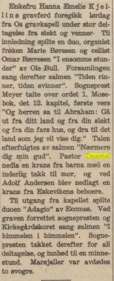 – og sier også noen ord på vegne av hennes familie, ved gravferden fra Os kapell lørdag 8. oktober 1938; det var ikke Andreas som forrettet, det var det sogneprest Meyer som gjorde, men fru Kjellin må allikevel ha hatt en sterk tilknytning til Metodistkirken i Halden, siden kransen ble nedlagt av metodistpastoren. Dette var altså ikke mange ukene etter at familien Daastøl ankom Halden-menigheten i august 38;
