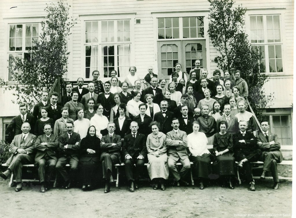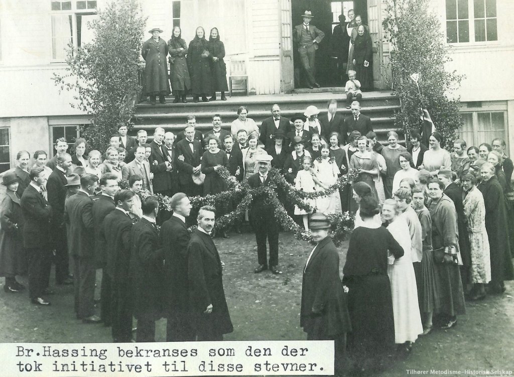 – noe som var et stevne for metodister fra de nordlige menigheter; dette var arrangert helt på tampen av våre besteforeldres tjeneste i Harstad-menigheten og deres flytting sørover for å betjene menigheten i Kristiansund. De var sommeren 1922 kommet dit som en familien på 3, mor, far og lille Elias, tilreisende fra Kristiania; nå – sommeren 1924 – var de 4, siden Norolf Nathan var født i Harstad høsten forut, 1. november 1923. Dette forklarer naturligvis at Andreas sees alene på bildet. Og vi ser andre kjente ansikter, ikke minst tilsynsmann for nordre distrikt Thomas Thomassen, men også Sigvald Rikstad kjenner vi igjen.