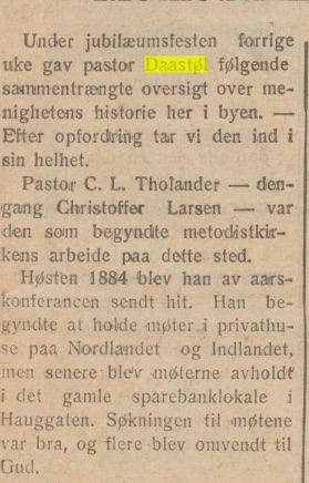 Pastor C. L. Tholander — den gang Christoffer Larsen — var den som begyndte Metodistkirkens arbeide paa dette sted.