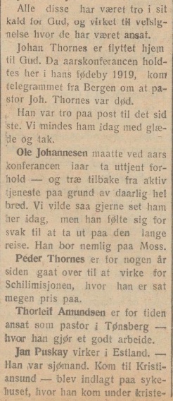 telegrammet fra Bergen om at pastor Joh. Thornes var død. Han var tro paa post til det sidste. Vi mindes ham idag med glæde og tak.