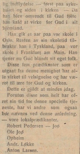 Foruten disse som helt har ofret sin tid for denne specielle tjeneste, har vi andre som ogsaa bør nævnes ved denne anledning — vore lokaliprædikanter.