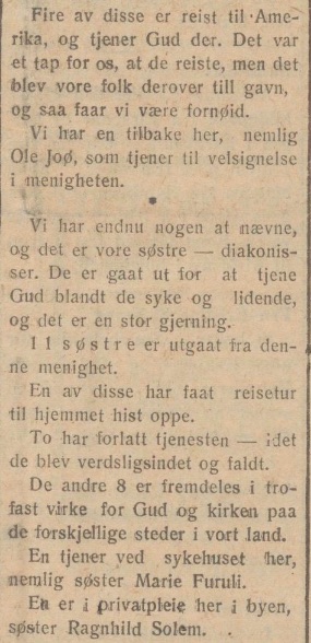 11 søstre er utgaat fra denne menighet. En av disse har faat reisetur til hjemmet hist oppe. To har forlatt tjenesten — idet de blev verdsligsindet og faldt. De andre 8 er fremdeles i trofast virke for Gud og kirken paa de forskjellige steder i vårt land. En tjener ved sykehuset her, nemlig søster Marie Furuli. En er i privatpleie her i byen, søster Ragnhild Solem.