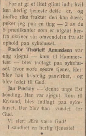 For at gi et litet glimt ind, i hvilken herlig tjeneste dette er, og hvilke rike frukter den kan bære, peker jeg paa en ting — 2 av de 5 prædikanter som er utgaat herfra skriver sin omvendelse fra sit ophold paa sykehuset. Pastor Thorleif Amundsen var ung sjøgut — kom til Hammerfest — blev indlagt paa sykehuset, hvor vone søstre tjener. Her blev han kristelig paavirket, i og blev ledet til Gud. Jan Puskay — denne unge Estlænding. Han var sjøgut. Kom til Kr.sund, blev indlagt paa syke huset. Der blev han vundet for Gud. Vi sier : Ære være Gud ! I sandhet en herlig tjeneste !