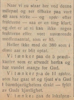 medlemsantal, som er 85. Heller ikke med de 380 som i disse aar er blit optat. Vi tænker paa de 5 prædikanter som er utsendt herfra og har vundet mange for Gud. Vi tænker paa de 11 søstre,