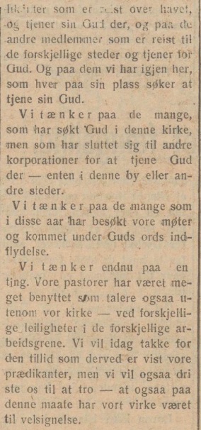 Og paa dem vi har igjen her, som hver paa sin plass søker at tjene sin Gud. Vi tænker paa de mange, som har søkt Gud i denne kirke, men som har sluttet sig til andre korporationer for at tjene Gud der — enten i denne by eller andre steder. Vi tænker paa de mange som i disse aar har besøkt vore møter og kommet under Guds ords indflydelse.