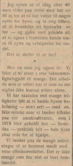 Mon nu maa jeg ogsaa si : Vi føler at vi staar i stor taknemmelighetsgjeld til mange. Det arbeide som er utført har vi som en menighet ikke kunnet utføre alene. Vi har saaledes ved mange l eiligheter følt at vi hadde byens befolkning — stort sett — med os.Ikke mindst naar vi tænker tilbake paa vor aarskonferance, som i 1919 blev avholdt her — hvordan — praktisk talt — hele byen stod rede for at hjælpe.