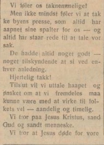 Men ikke mindst føler vi at takke byens presse, som altid har aapnet sine spalter for os — og altid har staar rede til at tale vor sak. De hadde i altid noget godt — noget tilskyndende at si ved enhver anledning. Hjertelig takk !