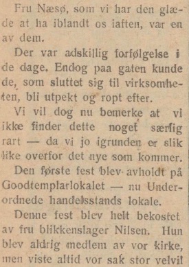 Hauggaten. Søkningen til møtene var bra, og flere blev omvendt til Gud. Fru Næsø, som vi har den glæde at ha iblandt os iaften, var en av dem.