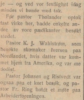 Pastor Johnsen og Ristvedt var ogsaa paa et kort besøk, og pastor Fr. Ring (Frederick Olsen Ring) holdt et møte paa Arbeiderforeningen.