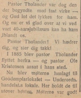 I 1885 blev pastor Tholander flyttet herfra — og pastor Ole Kristensen ansat i hans sted. Nu blev møterne henlagt til Goodtemplarlokalet — Underordn. handelst.s lokale. Her holdt de til