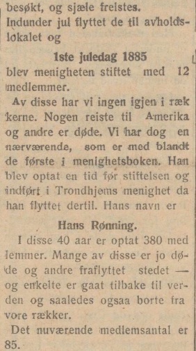 imedlemmer. Av disse har vi ingen igjen i rækkerne. Nogen reiste til Amerika og andre er døde. Vi har dog en nærværende, som er med blandt de første i menighetsboken. Han blev optat en tid før stiftelsen og indført i Trondhjems menighet da han flyttet dertil. Hans navn er Hans Rønning.