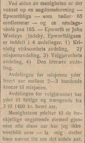 Avdelingcn for misjonen yder hvert aar mellem 2—3 hundrede kroner til misjonen. Avdelingen for velgjørenhet har ydet til fattige og trængende fra 3 (300) til 1400 kr. hvert aar. Menighetens ydelser til de forskjellige vegjørende øiemed gjennem alle disse aar har jeg ikke overblik over — la mig derfor bare nævne litt om det sidste aar.