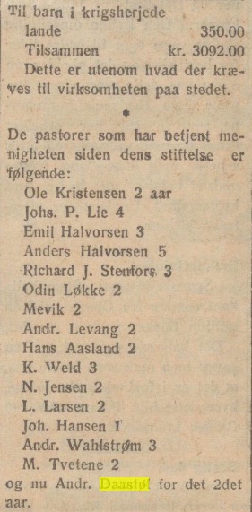 Vi tænker endnu paa en ting. Vore pastorer har været meget benyttet som talere ogsaa utenom vor kirke — ved forskjellige leiligheter i de forskjellige arbeidsgrene. Vi vil idag takke for den tillid som derved er vist vore prædikanter, men vi vil ogsaa driste os til at tro — at ogsaa paa denne maate har vort virke været til velsignelse.