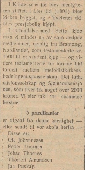 5 prædikanter er utgaat fra denne menighet — eller sendt til vor skole herfra —
