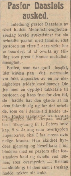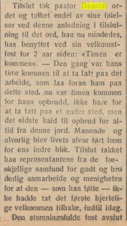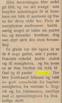 Avskjed for Daastøl-familien i menigheten i Kristiansund søndag 15. august 1926;