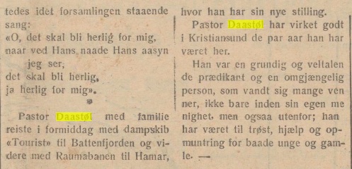 – artikkelen stod å lese på framsiden i Romsdalsposten onsdag 18. august 1926 – like før familien forlot Kristiansund N for å flytte til Hamar; i slutten av juni tidligere samme sommer hadde familien vært en tur til Flekkefjord og Kvanvik for å begrave lille Elias, som var gått bort tidligere samme måneden. Vi kan gå ut fra som ganske sikkert at familien hadde tatt båt sørover med Elias i en liten kiste – en reise i sorg for Andreas og Ingeborg, som bragte med seg sine to barn Norolf og Mirjam. Vi ser en annonse i Flekkefjord-avisen Agder for mandag 28. juni, der det er annonsert evangelisk møte på Hidra onsdag 30. juni kl. 8 kveld; her skulle Andreas (pastor Daastøl) delta sammen med de to andre pastorene Fossen og Conrad;