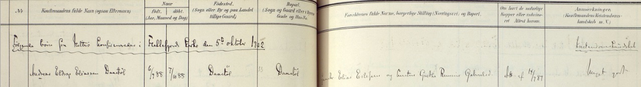 – hvor det står at «Følgende børn fra Hitterø (Hidra) konfirmeredes i Flekkefjord kirke den 5te oktober 1902»; videre kan vi lese at han både er født på og har bopel på Daastøl; fødselsdato er 6. sept. 1888 og dåpsdagen 7. okt. 1888. Hans foreldre er naturligvis «Gaardbruger Elias Eilifsen og hustru Grethe Remine Gabrielsdtr.».
