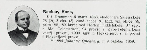 Nedenfor er hentet frem om de to som står nevnt i kilder som sogneprest og kateket i Flekkefjord året 1902, nemlig sogneprest Hans Backer og kateket Fredrik Herman Fladmark; så er det nok Backer som hadde ansvaret for vår morfar Andreas’ konfirmasjon.