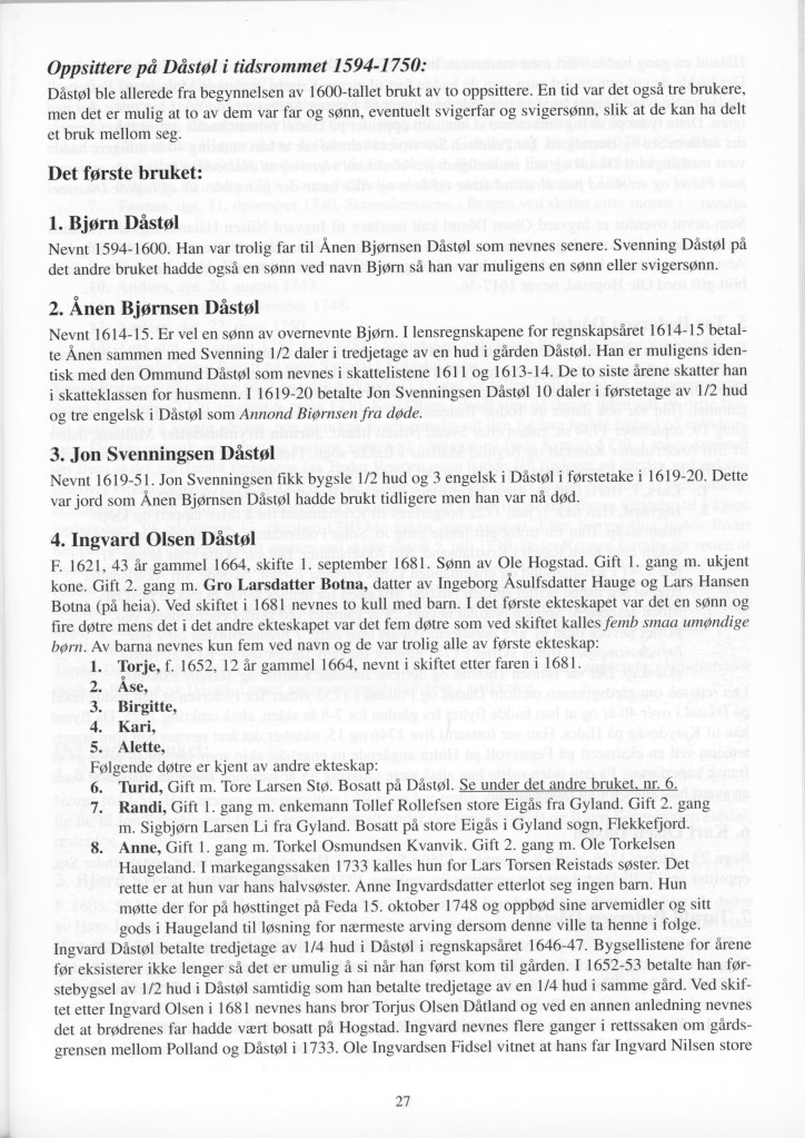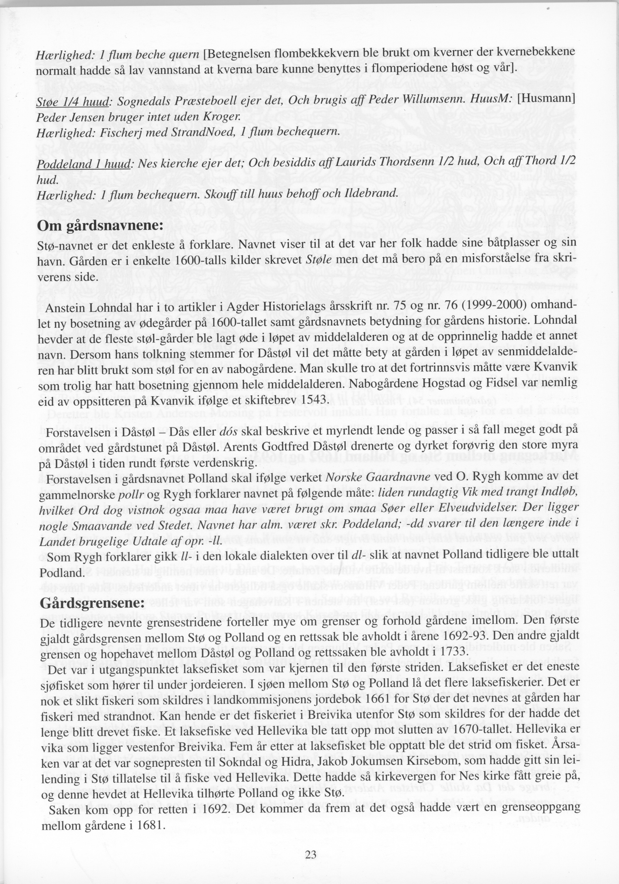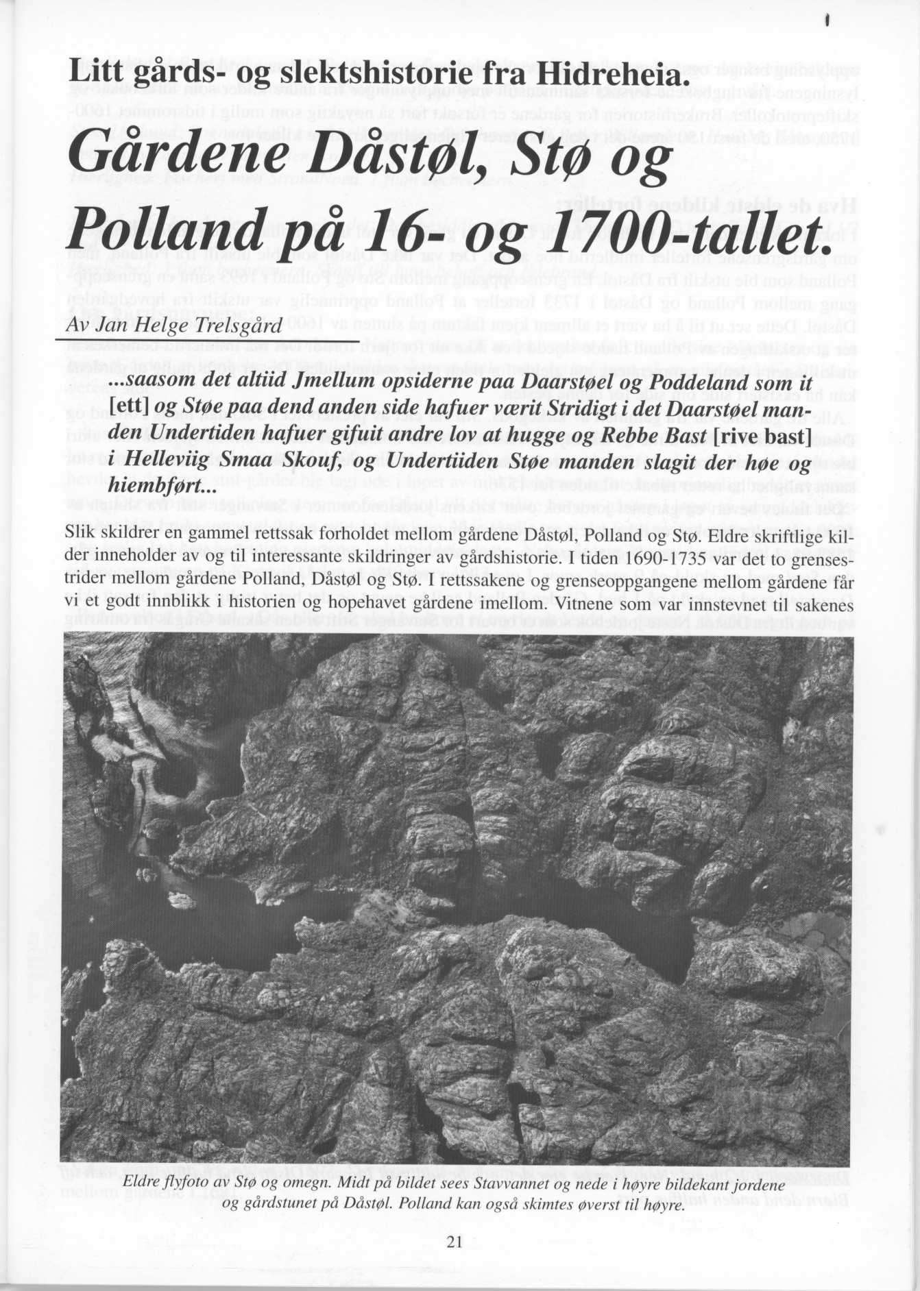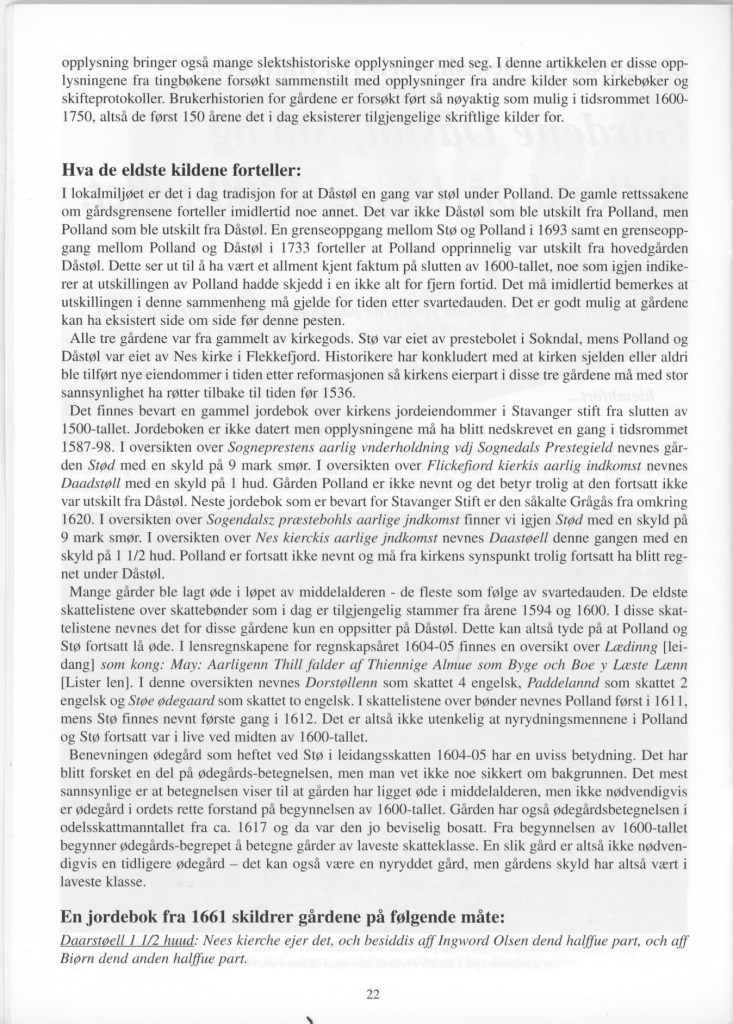 – og også betydningen av de to slekts- og steds-navn Daastøl og Polland finnes det opplysninger om; her gjengis et utdrag av en svært interessant artikkel skrevet av Jan Helge Trelsgård til Flekkefjord Historielags Årsskrift for 2007; først sidene 21 – 31, som omhandler i første rekke Daastøl (Dåstøl)- gården(e)(bruket) fra 1600-tallet og samtidig grensedragning til Polland-gården (bruket). Dernest følger sidene 37 – 41, som viser slektene som har bebodd Polland-bruket tilbake fra 1600-tallet :