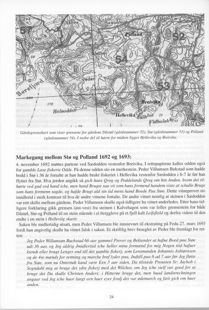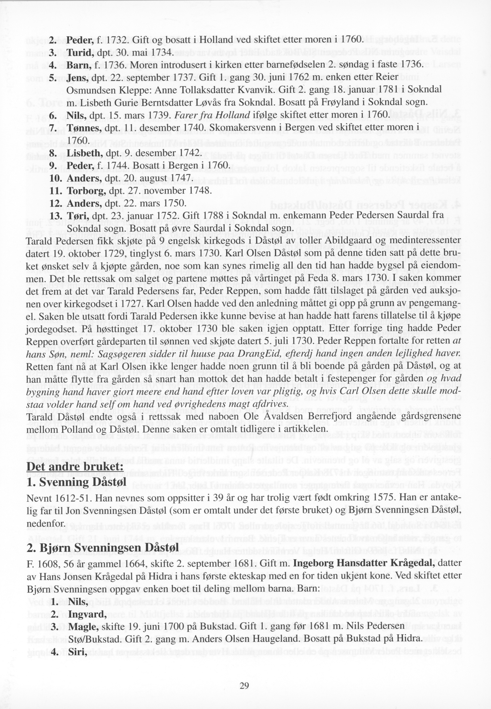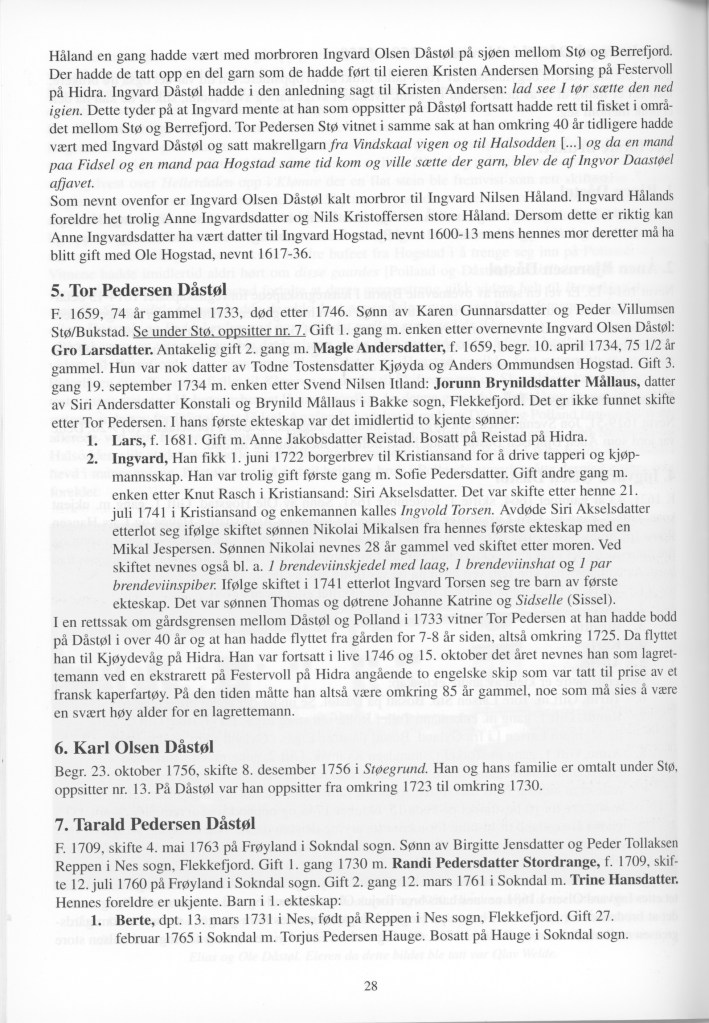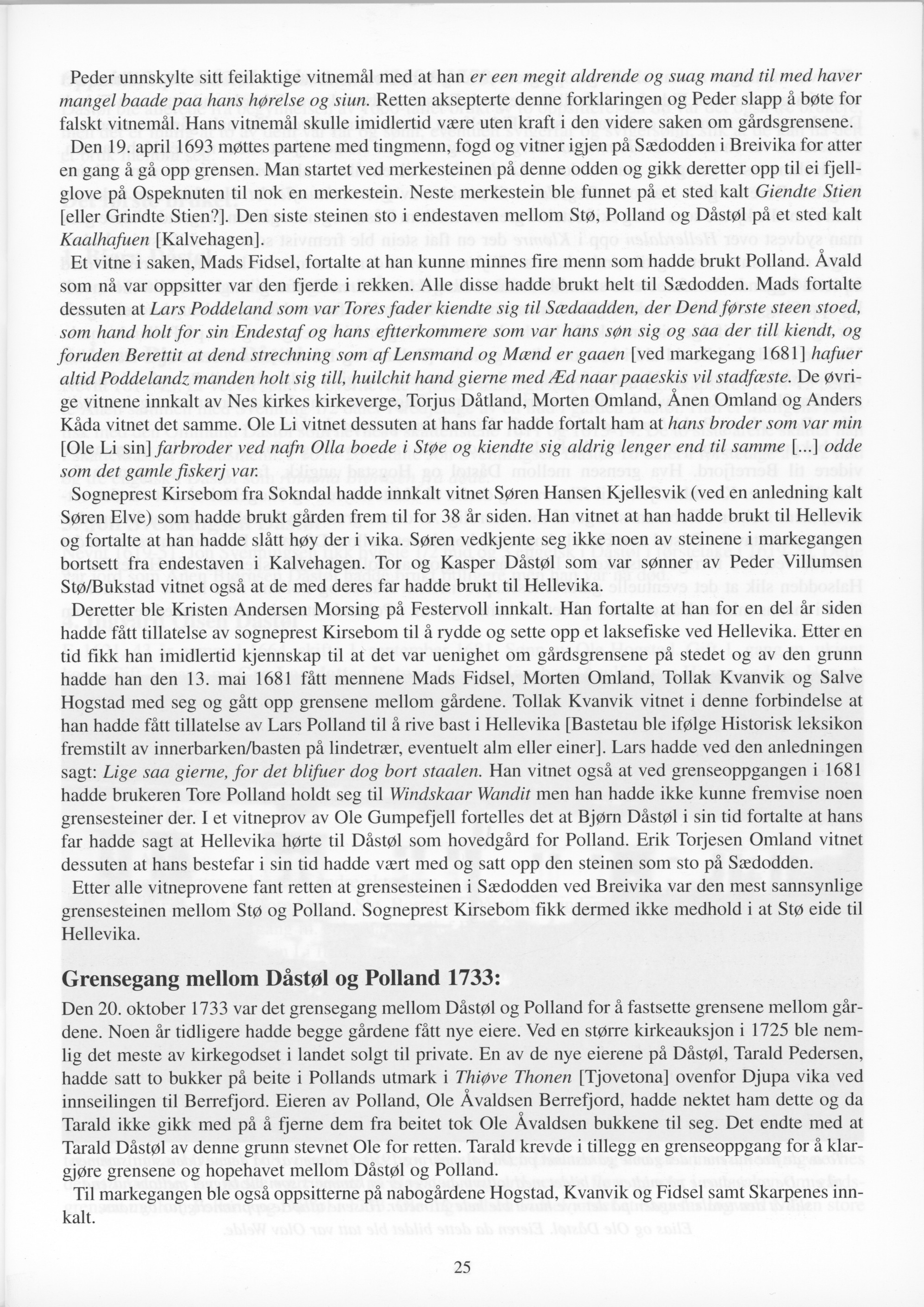 – og også betydningen av de to slekts- og steds-navn Daastøl og Polland finnes det opplysninger om; her gjengis et utdrag av en svært interessant artikkel skrevet av Jan Helge Trelsgård til Flekkefjord Historielags Årsskrift for 2007; først sidene 21 – 31, som omhandler i første rekke Daastøl (Dåstøl)- gården(e)(bruket) fra 1600-tallet og samtidig grensedragning til Polland-gården (bruket). Dernest følger sidene 37 – 41, som viser slektene som har bebodd Polland-bruket tilbake fra 1600-tallet :