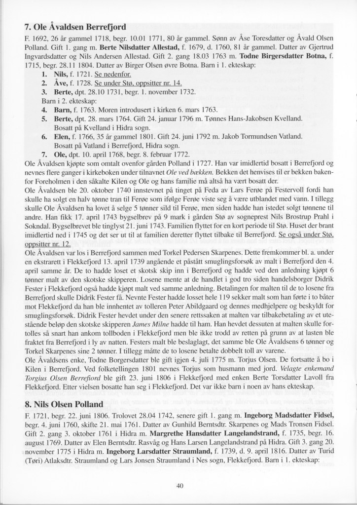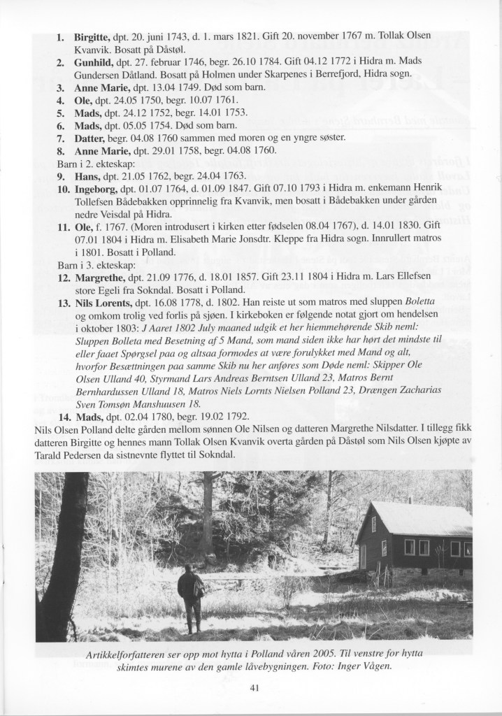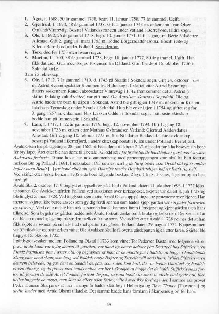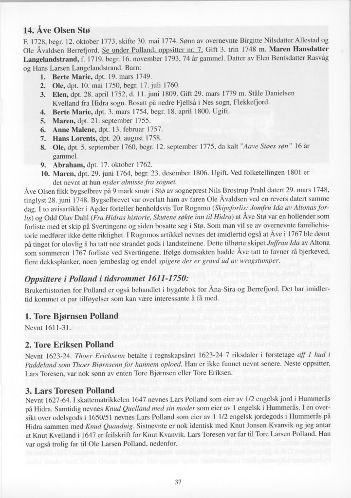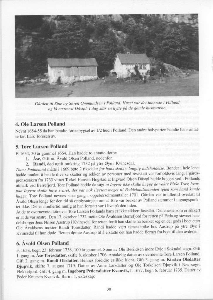 Nedenfor følger sidene 37 – 41 i samme artikkel og som omhandler Polland-oppsitterne, som dermed er forfedrene til Elias Ejlefsen Polland, en av våre 2 oldefedre på morfar Andreas Daastøls side; sidene mellom Daastøl- og Polland-gårdene omhandler Stø-bruket nede ved sjøen og er ikke tatt med her; litt interessant er det at disse mellomliggende sider (32-37) dekker forhistorien til metodistpastor Karsten Støs slekt – en prestekollega av både vår morfar og vår far. Karsten Stø-familien var forresten den som betjente Egersund-menigheten fra 1954 – 57, da vi kom dit fra Rjukan. Men her følger altså stoffet om Polland-slekten :