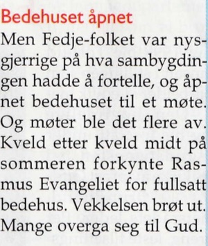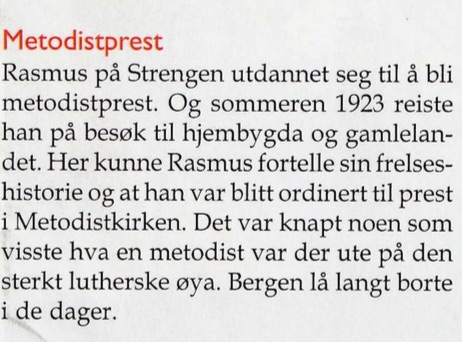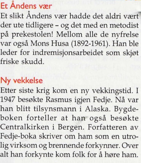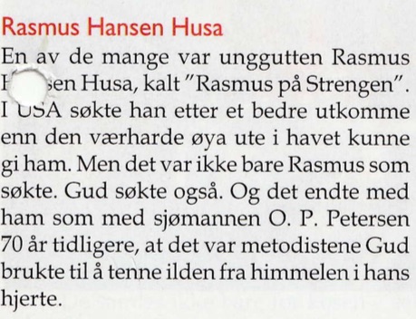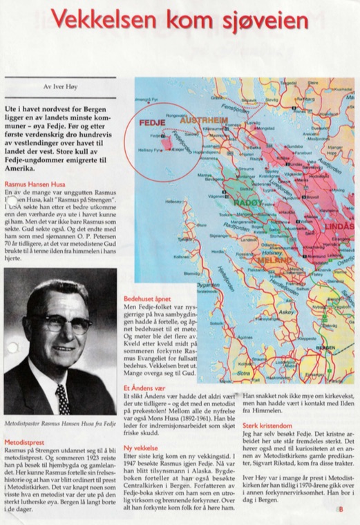 – om den amerikanske metodistpresten Rasmus Hansen Husa fra Fedje i Nordhordland – artikkel inntatt i metodistenes organ «Brobyggeren» tidlig i 2000 :