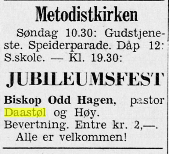 70-års jubileumsfesten i Egersund Metodistkirke i 1959 – under våre foreldre Mirjam og Ivers tid som pastorpar der