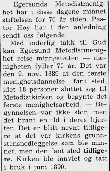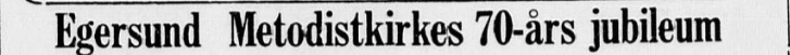 – i forbindelse med Egersund Metodistkirkes 70-års jubileum i november 1959; som vi ser, er artikkelen fra fredag 13. november, og jubileumsfesten ble avholdt den påfølgende søndag 15. november kl. 19.30, med gudstjeneste på formiddagen kl. 10.30. Vi merker oss at da var det også speider-parade og dåp av vår søster Inger. Denne søndagen var både vår morfar Andreas Daastøl og biskopen for Norden, Odd Hagen, til stede. Vi vet ikke hvem som foretok dåpen, men antakelsen er sterk at det var vår morfar, siden han allerede hadde foretatt dåpen av de to datter-sønnene Øyvind og Arvid på Rjukan i 1954 og i 1956. Det kan du se bekreftet på siden om Rjukan-årene. Men se møte-annonsen for søndagen helt nederst på siden her :