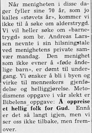 – i forbindelse med Egersund Metodistkirkes 70-års jubileum i november 1959; som vi ser, er artikkelen fra fredag 13. november, og jubileumsfesten ble avholdt den påfølgende søndag 15. november kl. 19.30, med gudstjeneste på formiddagen kl. 10.30. Vi merker oss at da var det også speider-parade og dåp av vår søster Inger. Denne søndagen var både vår morfar Andreas Daastøl og biskopen for Norden, Odd Hagen, til stede. Vi vet ikke hvem som foretok dåpen, men antakelsen er sterk at det var vår morfar, siden han allerede hadde foretatt dåpen av de to datter-sønnene Øyvind og Arvid på Rjukan i 1954 og i 1956. Det kan du se bekreftet på siden om Rjukan-årene. Men se møte-annonsen for søndagen helt nederst på siden her :