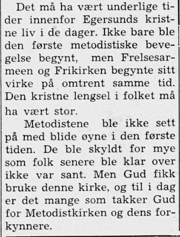 – kan du se kopi av nedenfor; artikkelen sto på trykk fredag 13. november 1959 og gir et interessant bilde av metodistmenigheten i Egersund, men forteller oss også mye om hvordan vår far på snart 34 år tenker på dette tidspunkt av hans liv.