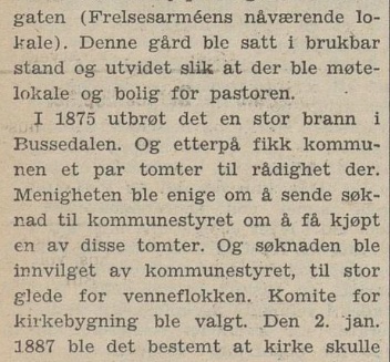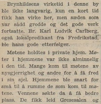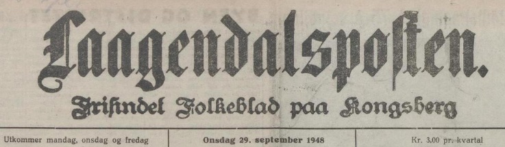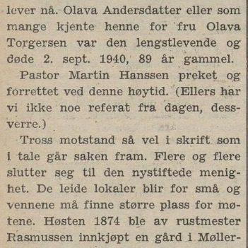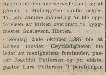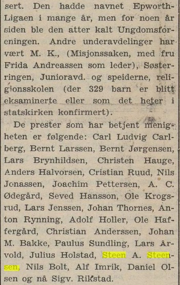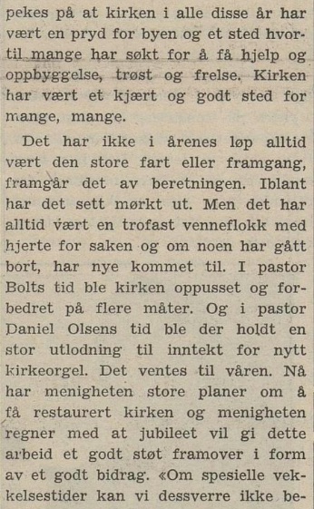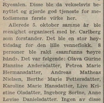 – ble markert også med en interessant artikkel i avisen Laagendalsposten dato 29. september 1948; dette var altså nær innpå 14 år før vår familie Høy kom dit i august 1962. Det bør jo nevnes at vi kjenner igjen på bildet under flere av dem som utgjorde kjernen i menigheten den gang vi kom, men som i bildeteksten ikke er nevnt : vi ser Olaf Hellerud, Ole Jacob Jensen, Georg Moen, Asborg Mikkelsen, Borghild Jensen, Karin Moen m.fl. :