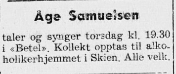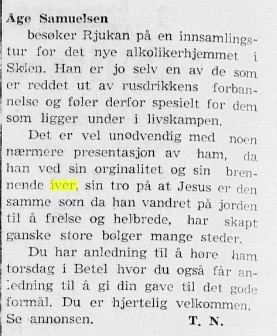 – det vår far fortalte, var at han innbød en god bekjent av seg og medlem i menigheten, brannsjef V., til å være med ham på dette møtet i «Betel». Denne hadde lenge hatt problemer med hodeverk. Da vår far og V. kom inn i lokalet, var det kun ledig plass helt framme – det vil si rett under prekestolen. Etter sin tale innbød Åge Samuelsen, sin vane tro, til forbønn. Vår far gav tegn til V. at dette var hans mulighet, hvilket også skjedde – han ble bedt for av Samuelsen. Forbønnen foregikk ved at Samuelsen grep om Vs hode og det ble beveget fram og tilbake under bønnen. Da møtet var slutt, gikk vår far og V. hver til sitt – vår far med den følelsen at dette kanskje hadde vært i drygeste laget for V. Men dagen etter dristet vår far seg til å ringe V, og fikk da høre at hodeverken var aldeles forsvunnet. Til dette uttrykte vår far det i sine siste år akkurat slik som vi kjenner godt igjen, nemlig – all ære til Gud.
