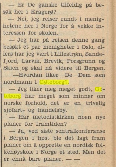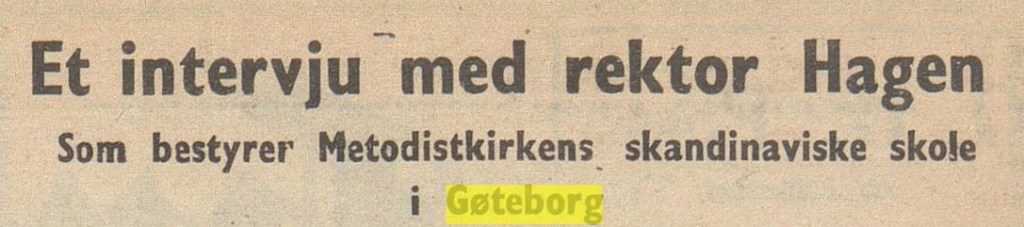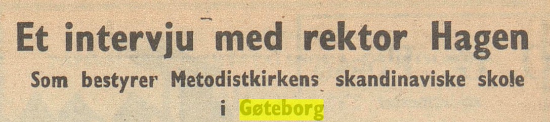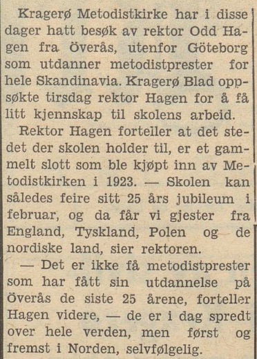 – da Hagen i egenskap av rektor ved Metodistkirkens teologiske skole på Øverås i Gøteborg gjestet Kragerø metodistmenighet, på sin reise omkring i flere menigheter for å presentere Øverås som institusjon. Som det går fram av intervjuet (på trykk torsdag 20. januar 1949), kom han til Kragerø fra besøk i metodist-menighetene i Skien, Porsgrunn og Brevik :