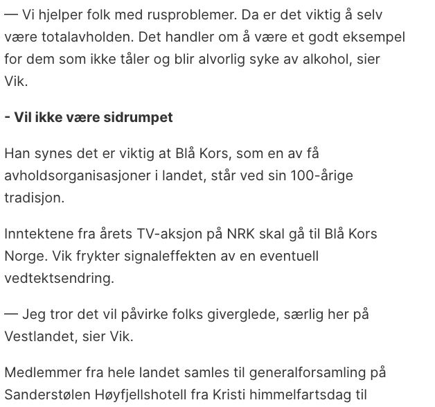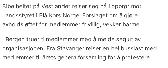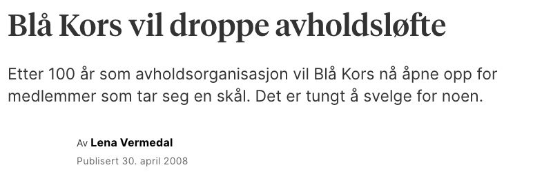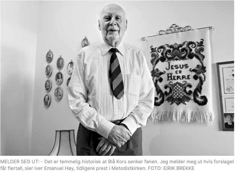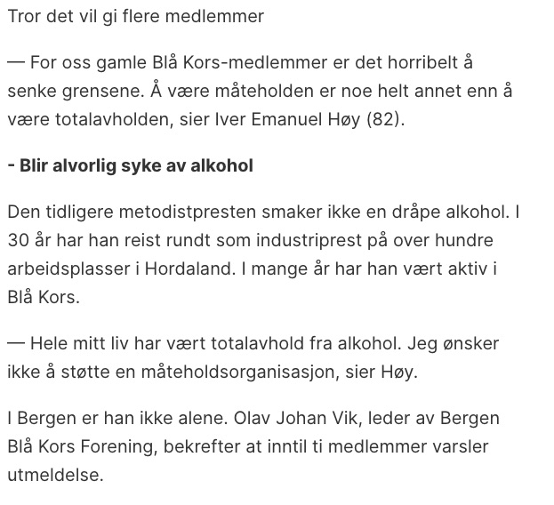 – slik vi ser av denne artikkelen i Bergens Tidende 30. april 2008; på dette tidspunktet var vår far 82 år, men fremdeles engasjert og kampklar. Det gikk altså i retning av at Blå Kors gav avkall på kravet om totalavhold for medlemmene. Teksten under bildet uttrykker godt vår fars syn i denne saken, nemlig at ved å gå tilbake på avholdenhets-kravet, ville «fanen bli senket». Noe som også deretter skjedde og som medførte at våre foreldre sa opp sitt Blå Kors-medlemsskap. Her er artikkelen fra B.T. :