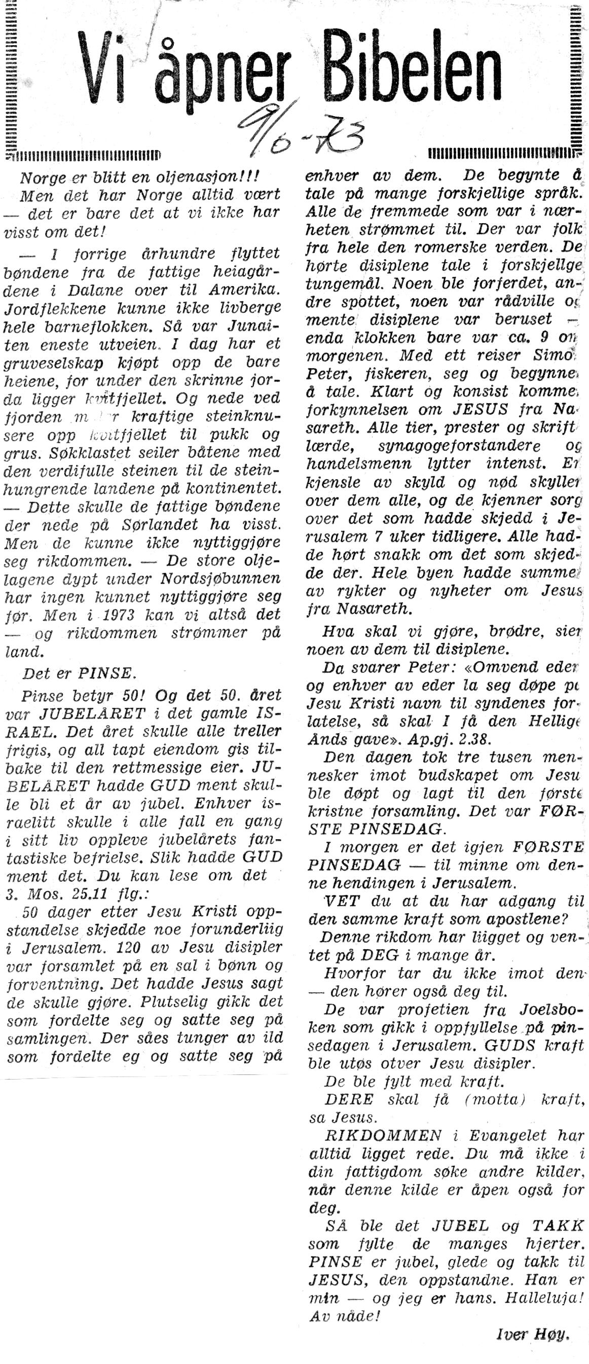 Intervju med vår far Iver Høy i Dalane Tidende – i forbindelse med Egersunds-menighetens 70-års jubileum i november 1959;